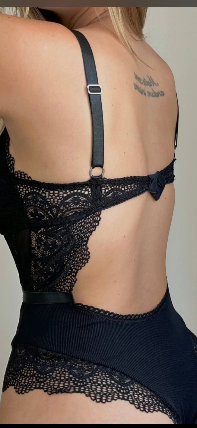 Micro-morley and lace bodysuit with a cutout and strappy front. Lined, non-see-through!