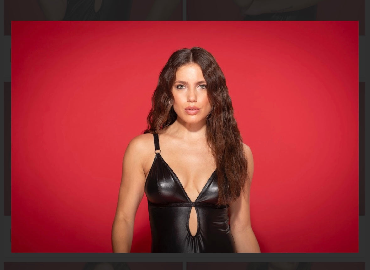 Vegan leather bodysuit with a front and back opening combined with lace trim. It features two adjustable straps in the back and a hook in the crotch